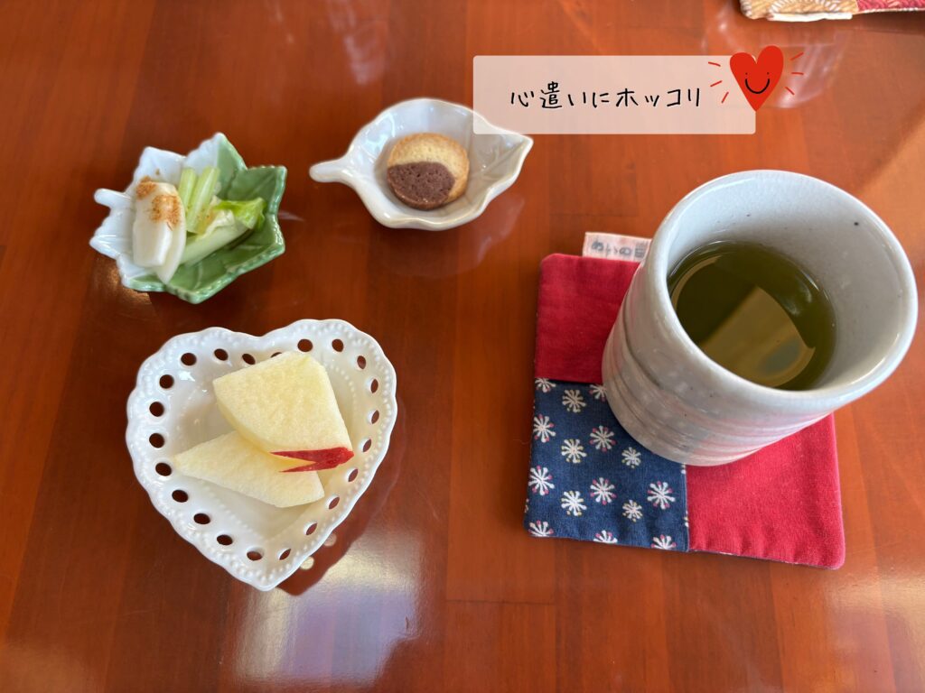 注文したロールケーキとは別に、温かいお茶とお漬物、リンゴのサービスまでありました!