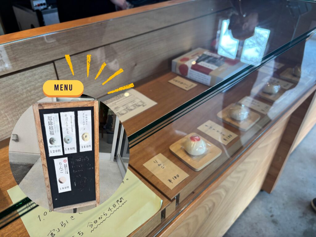 お店ではおまんぢゅうやおやき他、コーヒーなどのドリンクが注文でき、イートインできます。