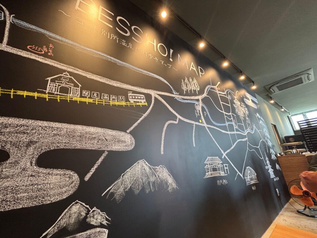 手書き風の別所温泉街歩きマップが描かれた壁画がポイントのおしゃれな空間が広がっています。