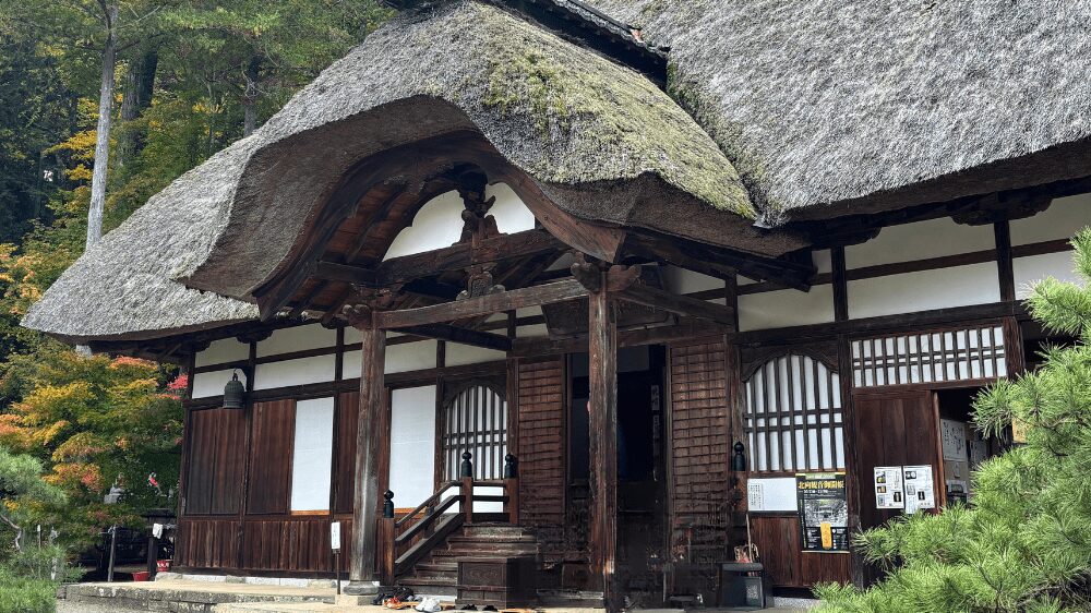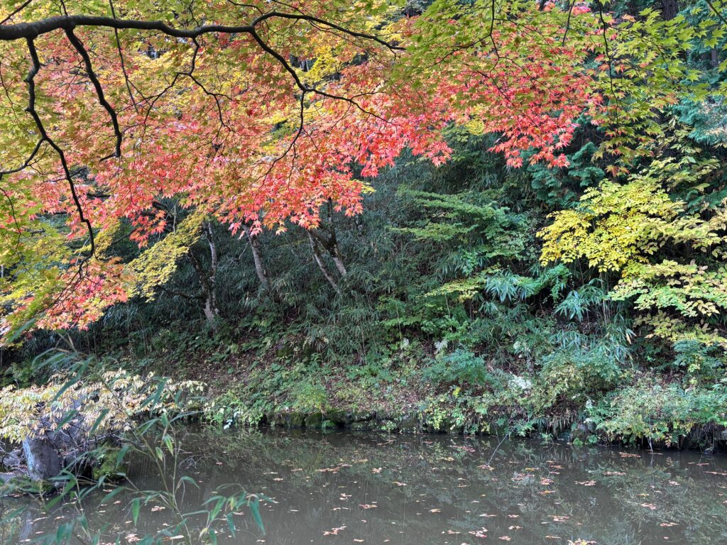 茅葺き屋根の本堂と紅葉のコントラストを楽しんだり、境内の池に散って絨毯を作る紅葉の葉を眺めたり。