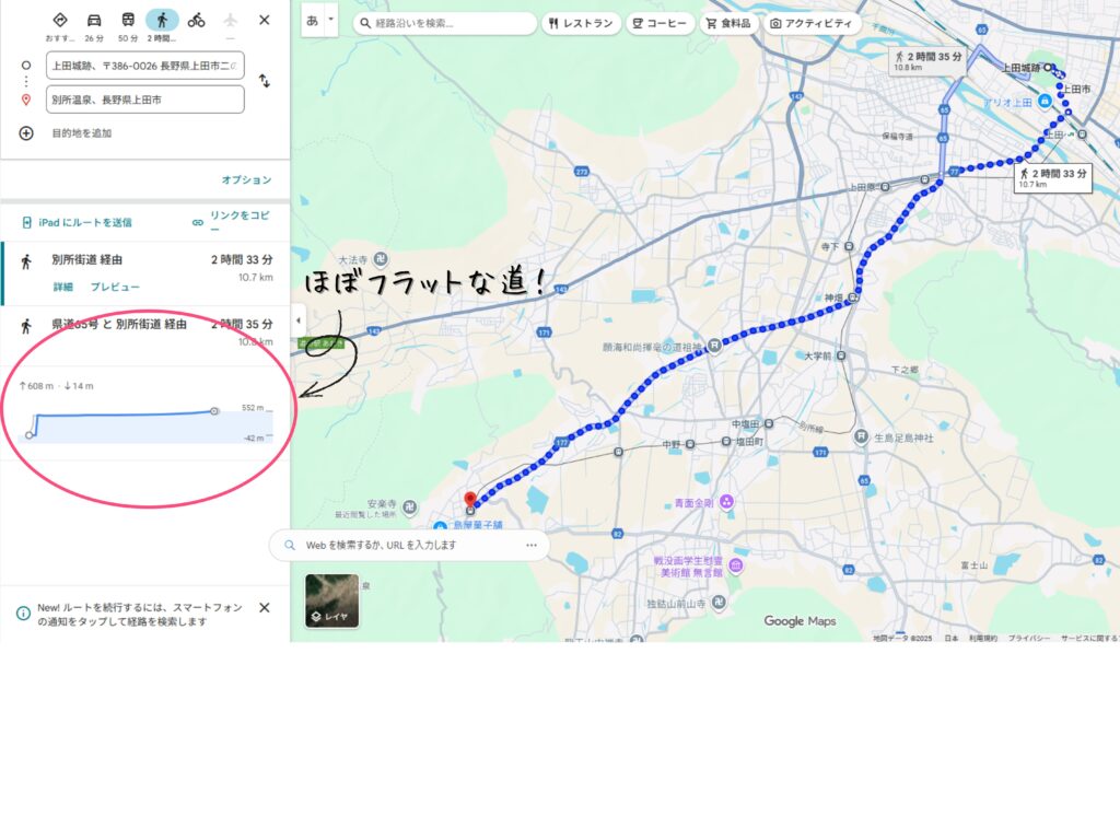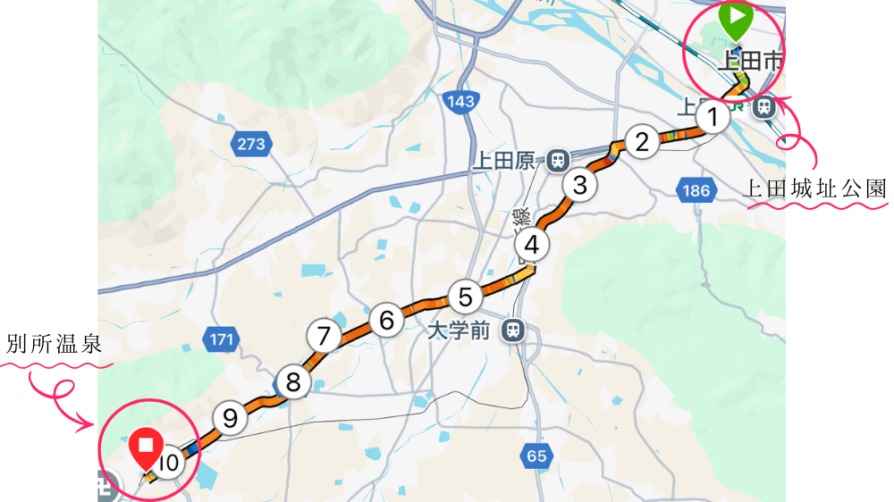上田電鉄別所線沿いを走るルートなので、疲れたら電車旅に切り替えられる気楽さもポイント。
