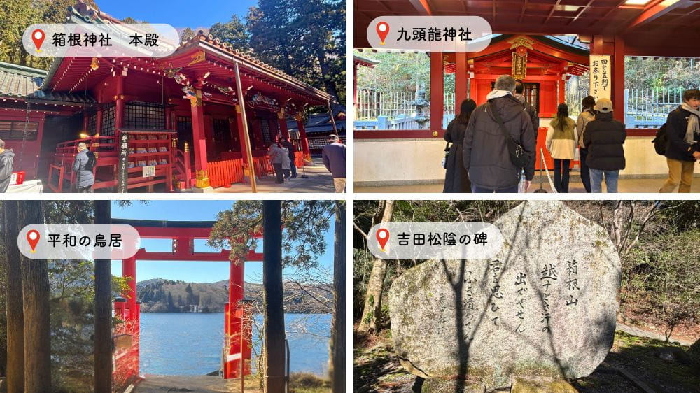 立派な「ご本殿」をはじめ、ベストショットが狙える映えスポット「平和の鳥居」や幕末好きが見逃せない「吉田松陰の碑」、芦ノ湖の守護神・九頭龍大神をお祀りする「九頭龍神社」などなど、広い境内には見どころが沢山!