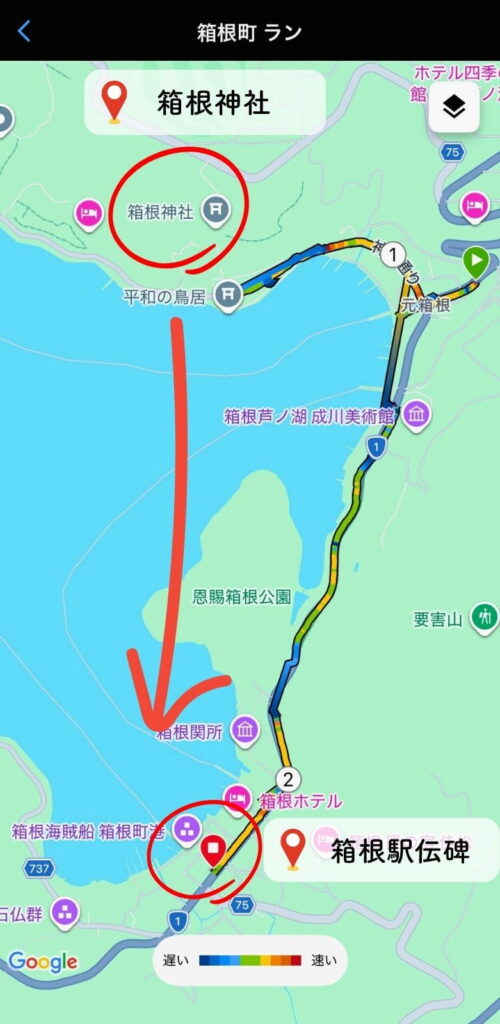 筆者がご紹介するのは「箱根神社」から「東京箱根間往復大学駅伝競走往路ゴール・復路スタート碑」まで、東海道沿いに約2.5kn走るコースです。