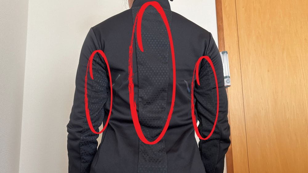 腕部分や背面部が一部メッシュ素材になっているので、汗をかきすぎる心配がないところもポイント。