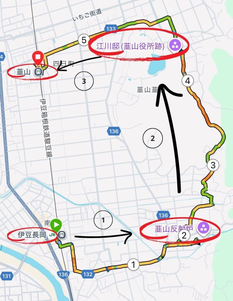 伊豆韮山駅をスタート地点に、「韮山反射炉」「江川邸」に立ち寄りながら、韮山駅をゴールとするコース。