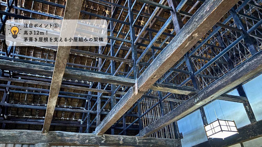 注目ポイント①:高さ12mにもなる茅葺き屋根を支える小屋組みの架構