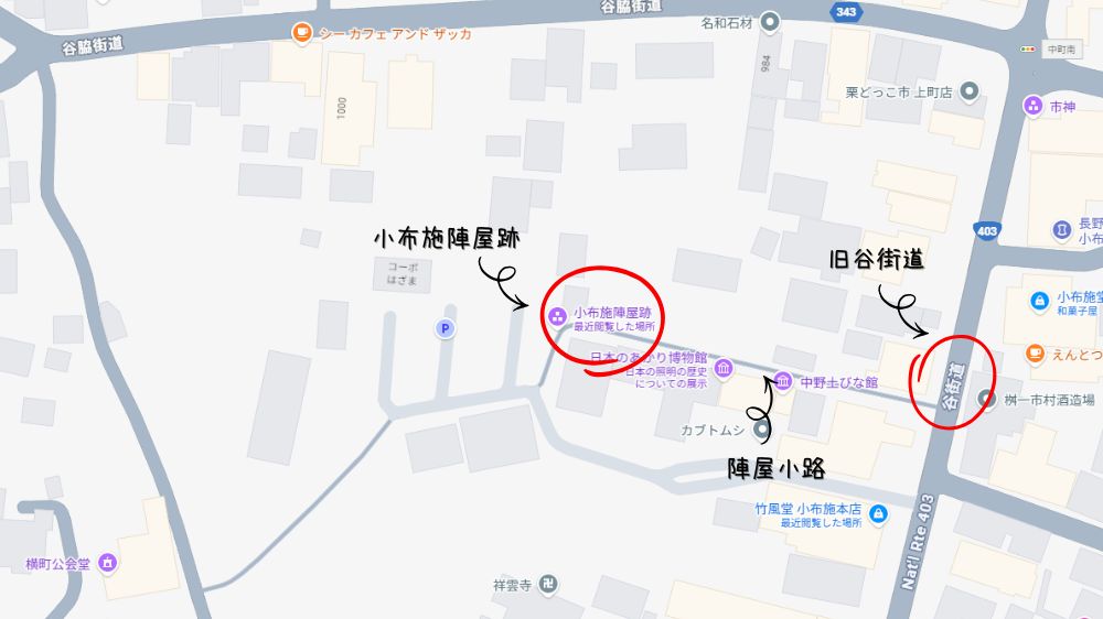旧谷街道(現:国道403号)から入るこの小路を「陣屋小路」と呼び、約100m西方に陣屋が一していました。