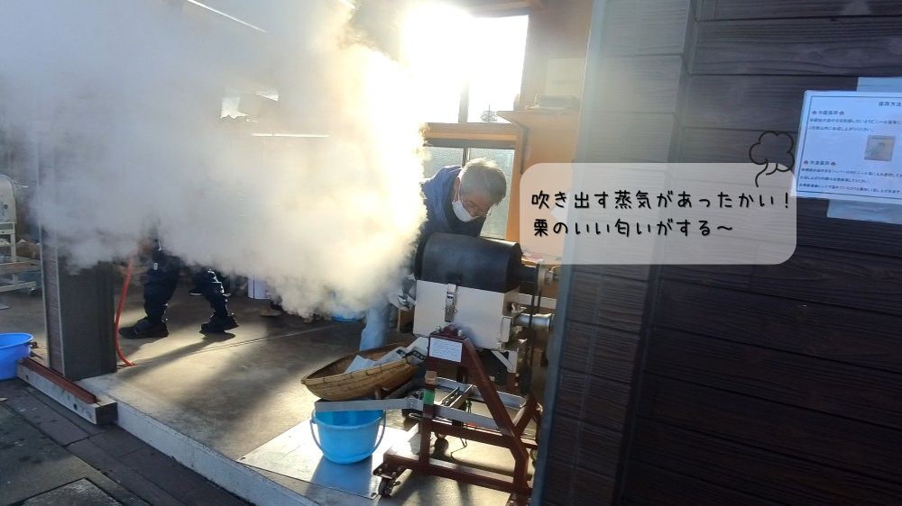 店先では圧力釜でじっくり焼き上げられる焼き栗の様子を見学できますよ。