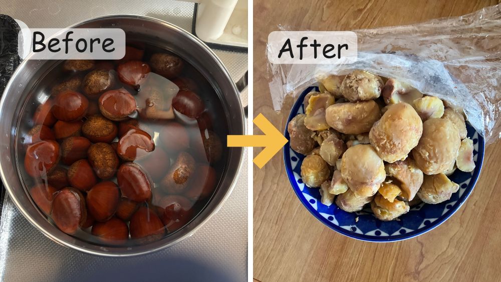 網いっぱいの栗は、自宅に帰ってから灰汁を抜き、圧力鍋で柔らかくしました。