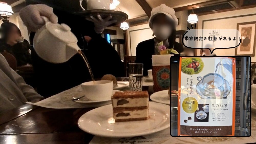 ケーキと栗の絶妙な甘さ加減を味わえ、スッキリとした飲み心地の紅茶との相性は抜群です。